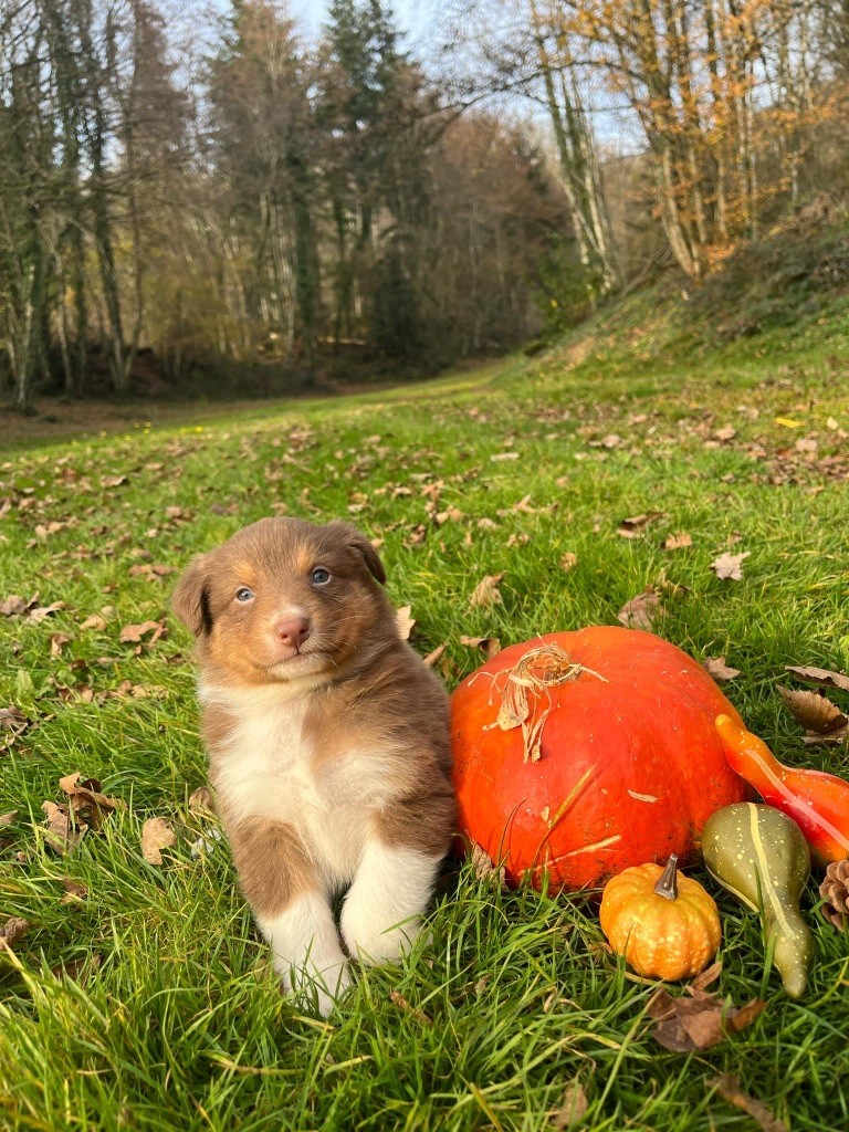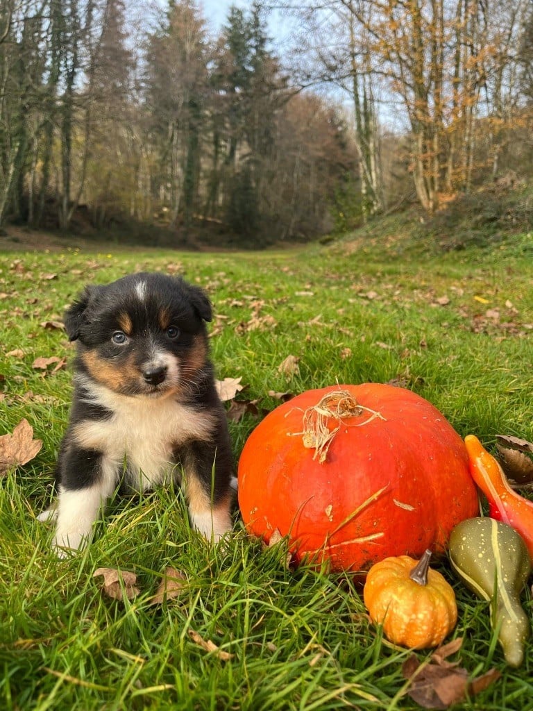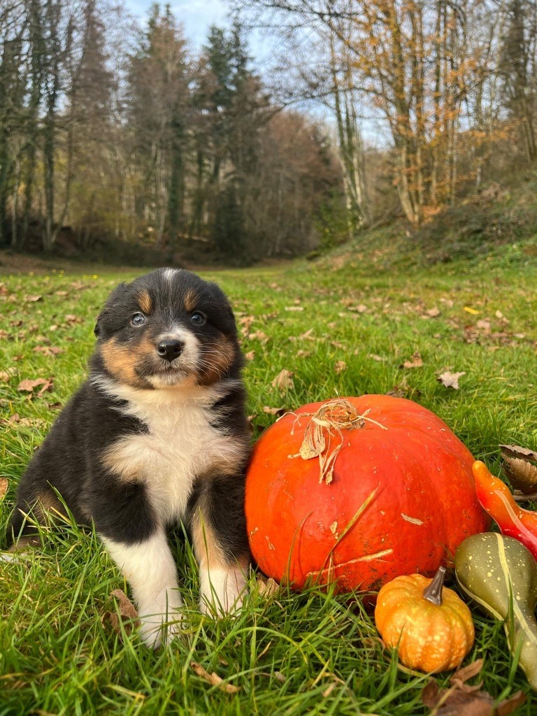 Parmi les mâles nous avons 1 chiot de robe bleue merle, 1 chiot de robe rouge tricolore et 1 chiot de robe noire tricolore.